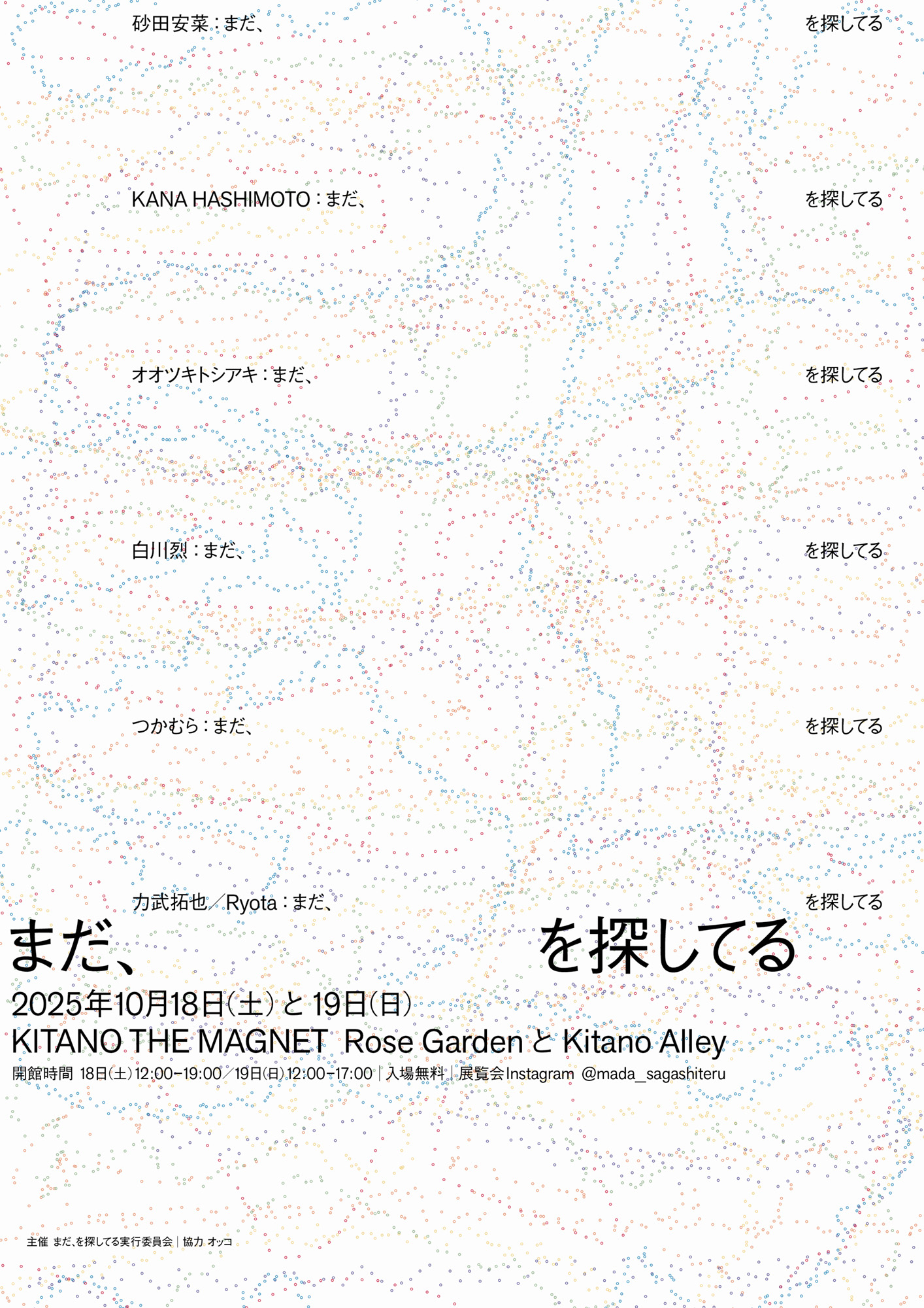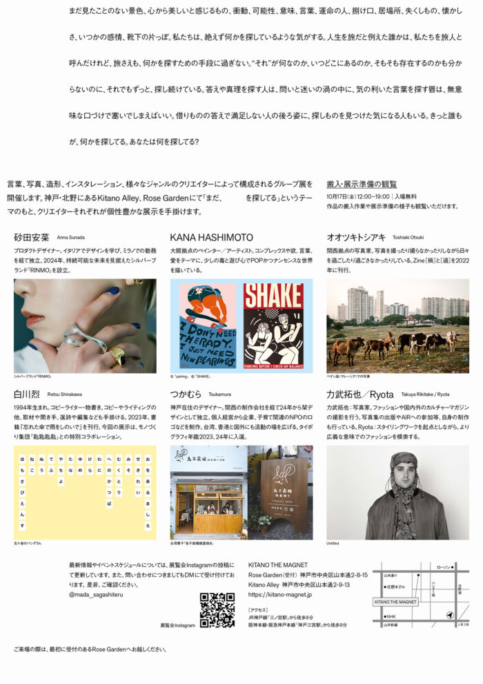 言葉、写真、造形、インスタレーション、様々なジャンルのクリエイターによって開催するグループ展示を開催します。神戸・北野にある安藤忠雄建築 Kitano Alley、Rose Gardenの二棟を貸切り、「まだ、 を探してる」 というテーマのもと、クリエイターそれぞれが個性豊かな展示を手掛けます。